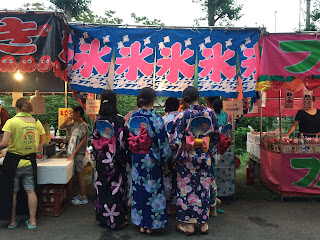 | สาวๆ ในชุดยุคาตะที่ร้านน้ำแข็งใสในงานดอกไม้ไฟ |